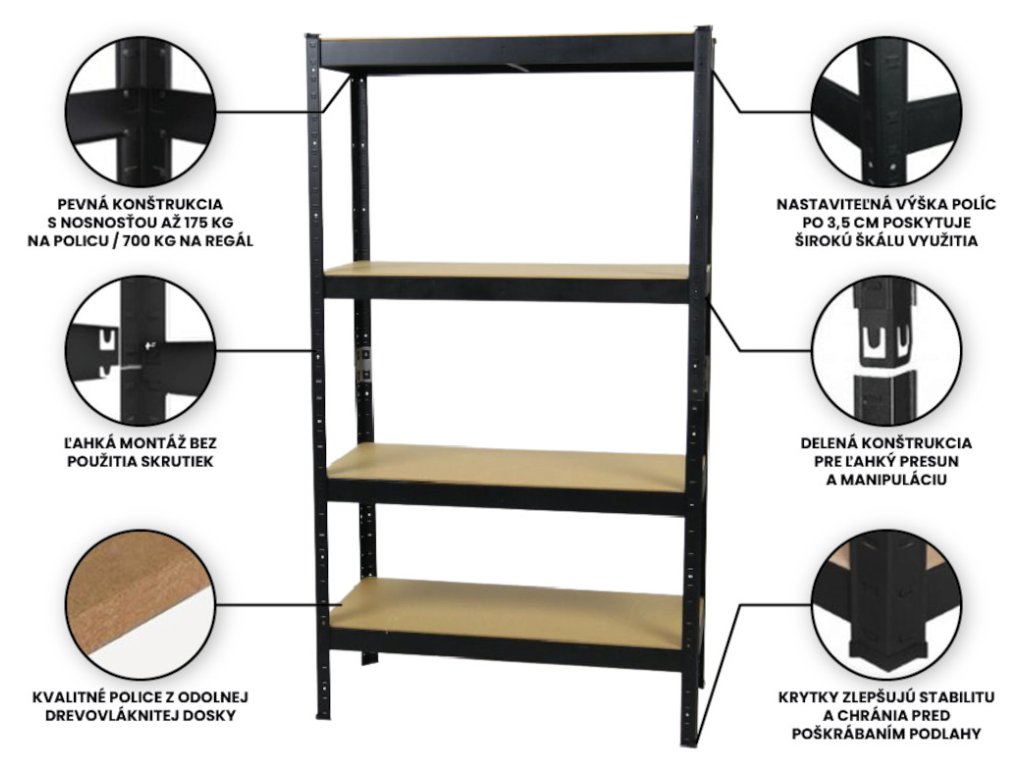 Regál štandardného typu s nosnosťou do 175 kg na jednu policu nájde využitie ako v domácnosti, tak aj v kancelárii alebo malom sklade. Poskytuje prehľadné uloženie tovaru, dokumentov alebo náradia a šetrí miesto. Kvalitný materiál a robustná konštrukcia zaistí dlhú životnosť a odolnosť voči poškodeniu. Zároveň je jeho montáž veľmi jednoduchá a zostavenie regálu nezaberie celé popoludnie.