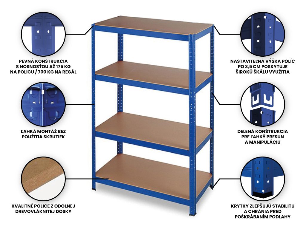 Regál štandardného typu s nosnosťou do 175 kg na jednu policu nájde využitie ako v domácnosti, tak aj v kancelárii alebo malom sklade. Poskytuje prehľadné uloženie tovaru, dokumentov alebo náradia a šetrí miesto. Kvalitný materiál a robustná konštrukcia zaistí dlhú životnosť a odolnosť voči poškodeniu. Zároveň je jeho montáž veľmi jednoduchá a zostavenie regálu nezaberie celé popoludnie.