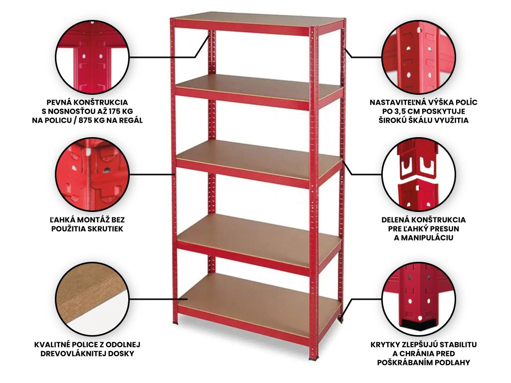 Regál štandardného typu s nosnosťou do 175 kg na jednu policu nájde využitie ako v domácnosti, tak aj v kancelárii alebo malom sklade. Poskytuje prehľadné uloženie tovaru, dokumentov alebo náradia a šetrí miesto. Kvalitný materiál a robustná konštrukcia zaistí dlhú životnosť a odolnosť voči poškodeniu. Zároveň je jeho montáž veľmi jednoduchá a zostavenie regálu nezaberie celé popoludnie.
