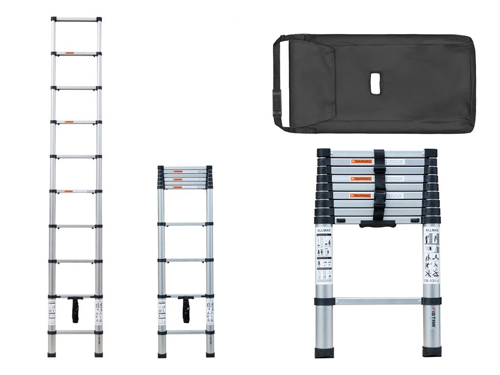 Zložený teleskopický rebrík je uložený v prenosnej taške. Vďaka tomu sa ľahko prenáša, skladuje a nepráší sa naň. Vyniká nízkou hmotnosťou a v zloženom stave sa ľahko zmestí do auta. Zároveň je veľmi odolný a bezpečný. Vydrží zaťaženie až 150 kg.