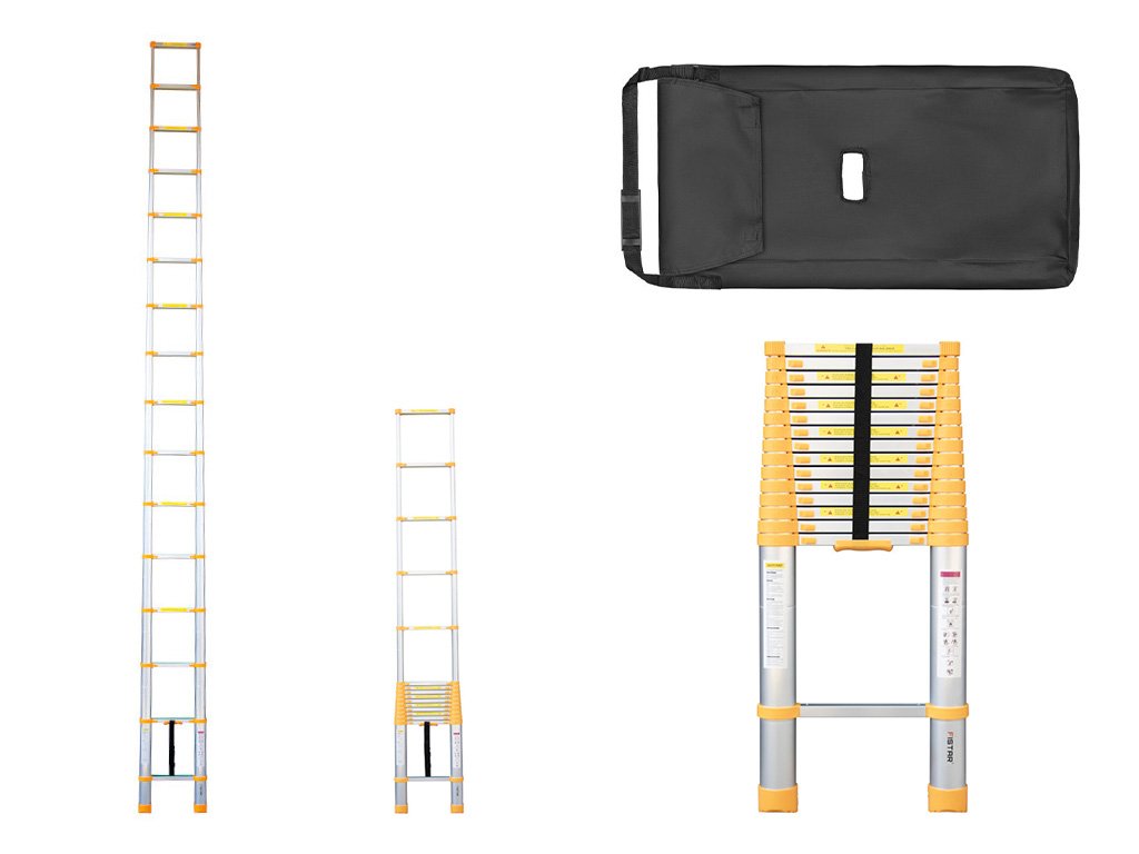 Zložený teleskopický rebrík je uložený v prenosnej taške. Vďaka tomu sa ľahko prenáša, skladuje a nepráší sa naň. Vyniká nízkou hmotnosťou a v zloženom stave sa ľahko zmestí do auta. Zároveň je veľmi odolný a bezpečný. Vydrží zaťaženie až 150 kg.
