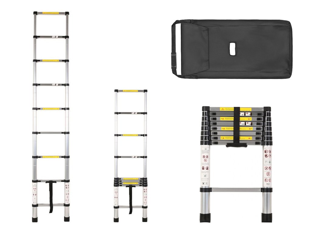 Zložený teleskopický rebrík je uložený v prenosnej taške. Vďaka tomu sa ľahko prenáša, skladuje a nepráší sa naň. Vyniká nízkou hmotnosťou a v zloženom stave sa ľahko zmestí do auta. Zároveň je veľmi odolný a bezpečný. Vydrží zaťaženie až 150 kg.