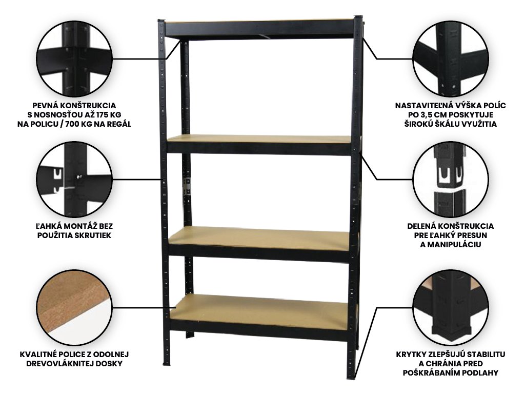 4 drevovláknité police šírky 4 mm s certifikovanou nosnosťou až 175 kg a konštrukciou z valcovanej ocele robia z tohto regálu profesionálny úložný priestor. Vysokú stabilitu zabezpečí aj následné uchytenie do steny, ale taktiež voľne stojaci regál uspokojí aj tých najnáročnejších užívateľov.