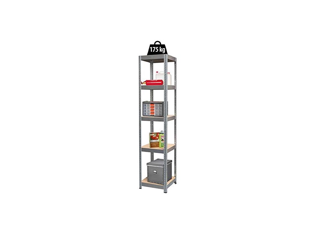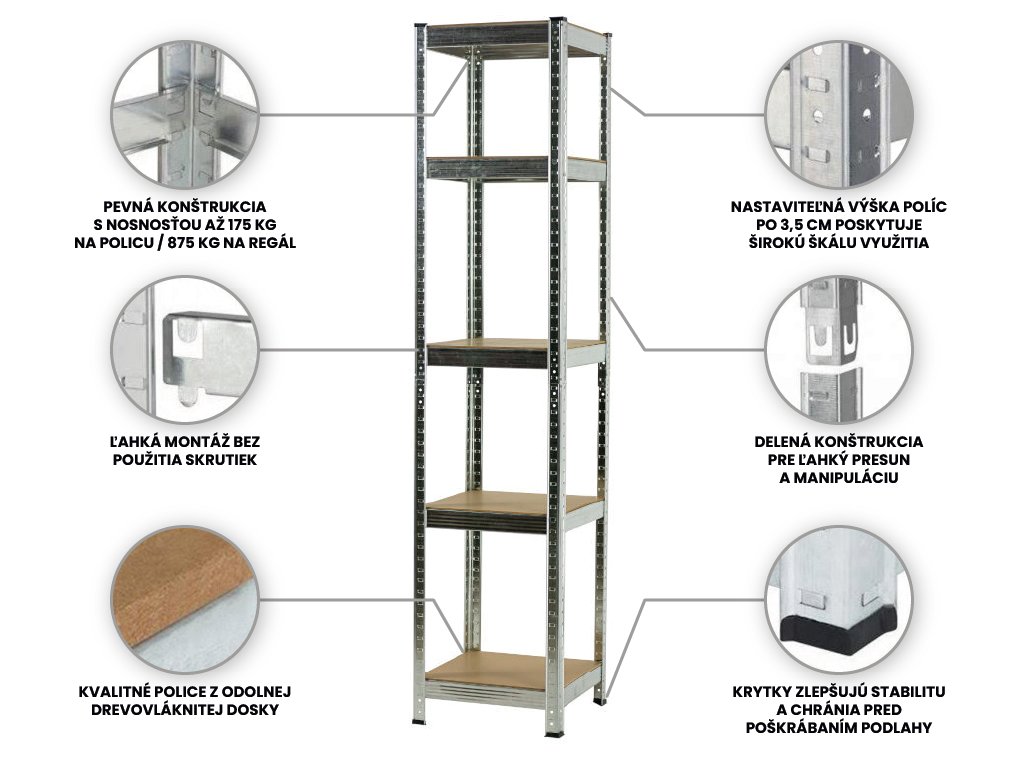 Je vyrobený z valcovanej ocele a police z drevovláknité dosky. Táto kombinácia zaisťuje stabilné vlastnosti regálu. Veľkosť regálu je 1800mm × 400mm × 400mm a príde Vám zložený v krabici v rozmeroch 900mm x 400mm x 55mm. Na tento regál je záruka 7 rokov.